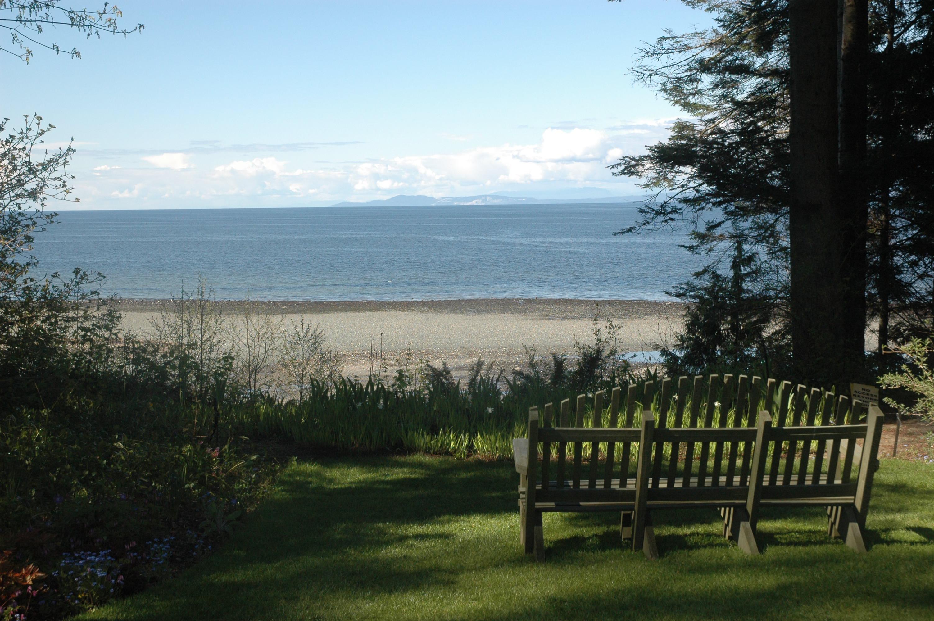| Lo Hi | April 2007 Vacation in Vancouver, BC. This bench is on the lawn in front of the Tea Room at Milner Gardens near Qualicum Beach on Vancouver Island. It looks back across the straits towards the mainland. | |